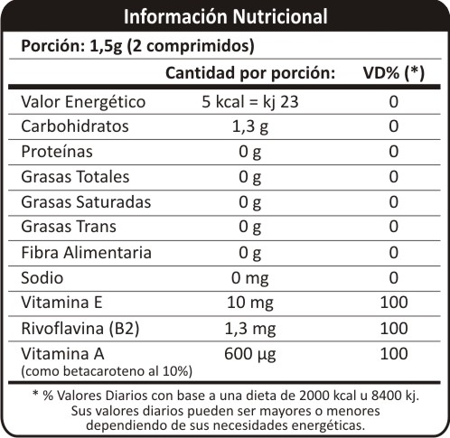 Ingredientes: Vitamina E, Vitamina B2 y Vitamina A (Betacaroteno al 10%)