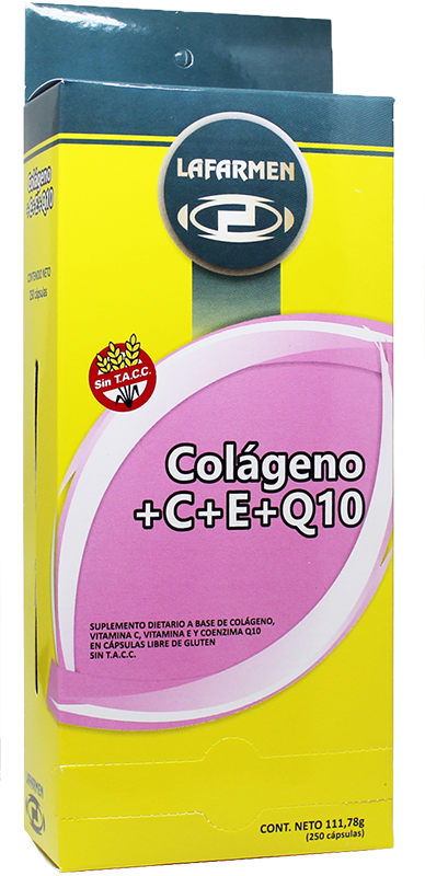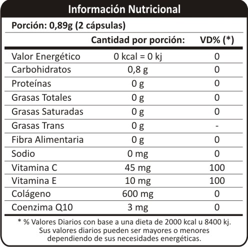 Ingredientes: Colágeno hidrolizado, Vitamina C, Vitamina E, Coenzima Q10