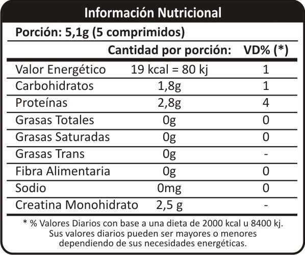 Ingesta recomendada: 5 comprimidos por día, 3 comprimidos 30 minutos antes del ejercicio y 2 comprimidos después del ejercicio, con abundante líquido.