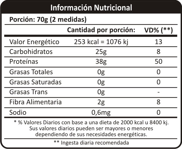 Ingredientes: Proteína de suero, Proteína de soja, Ovo albumina, Escencia artificial de vainilla (ARO).