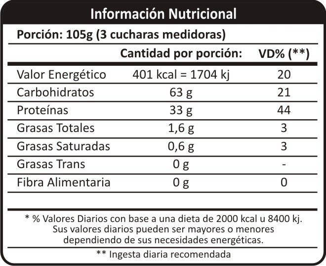 Ingredientes: Proteína de suero de queso, Proteína concentrada de lácteos (leche), Glucosa, Cacao en polvo ó ARO vainilla
